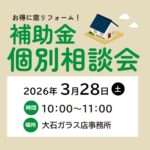 2026年3月11日 イベント 補助金個別相談会 開催のお知らせ! 窓リフォームに活用できる補助金の相談会を開催します! 補助金を活用してどんな工事ができるの?どのくらい補助金がでるの?窓やドアのお悩みなど…なんでもご相談ください! 窓の高さと幅をメモして参加した方には、その場で […]